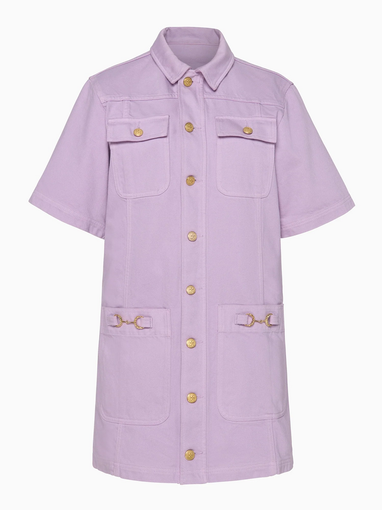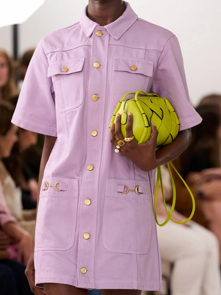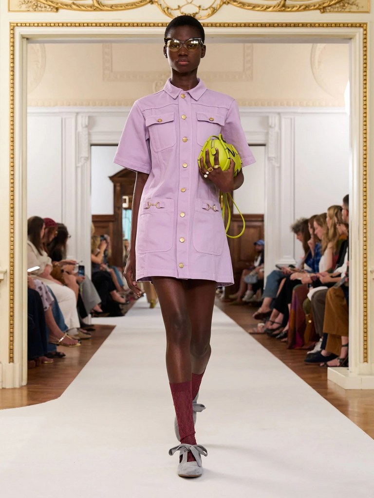 Look 29 on the SS26 Runway, the Painters Dress by Ulla Johnson is awash in a serene, Wisteria lavender inspired by the ethereal works of American painter Helen Frankenthaler. This effortless style has a shirt-inspired silhouette with utilitarian pockets and signature twisted horse-bit hardware.