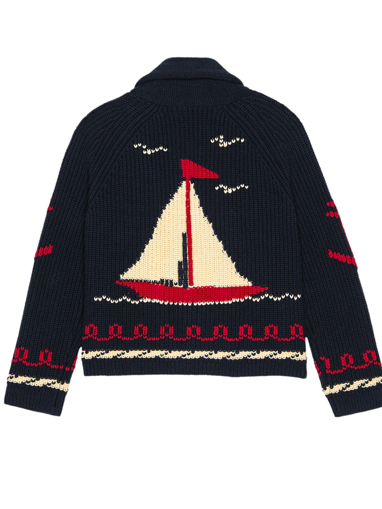 Inspired by a 1960s kids' sweater, The Sailboat Lodge Cardigan by The Great features hand-embroidered boats and sailor motifs on our best-selling Lodge Cardigan. Spun from a soft cotton blend yarn, this cozy piece beautifully blends maritime nostalgia with everyday comfort.